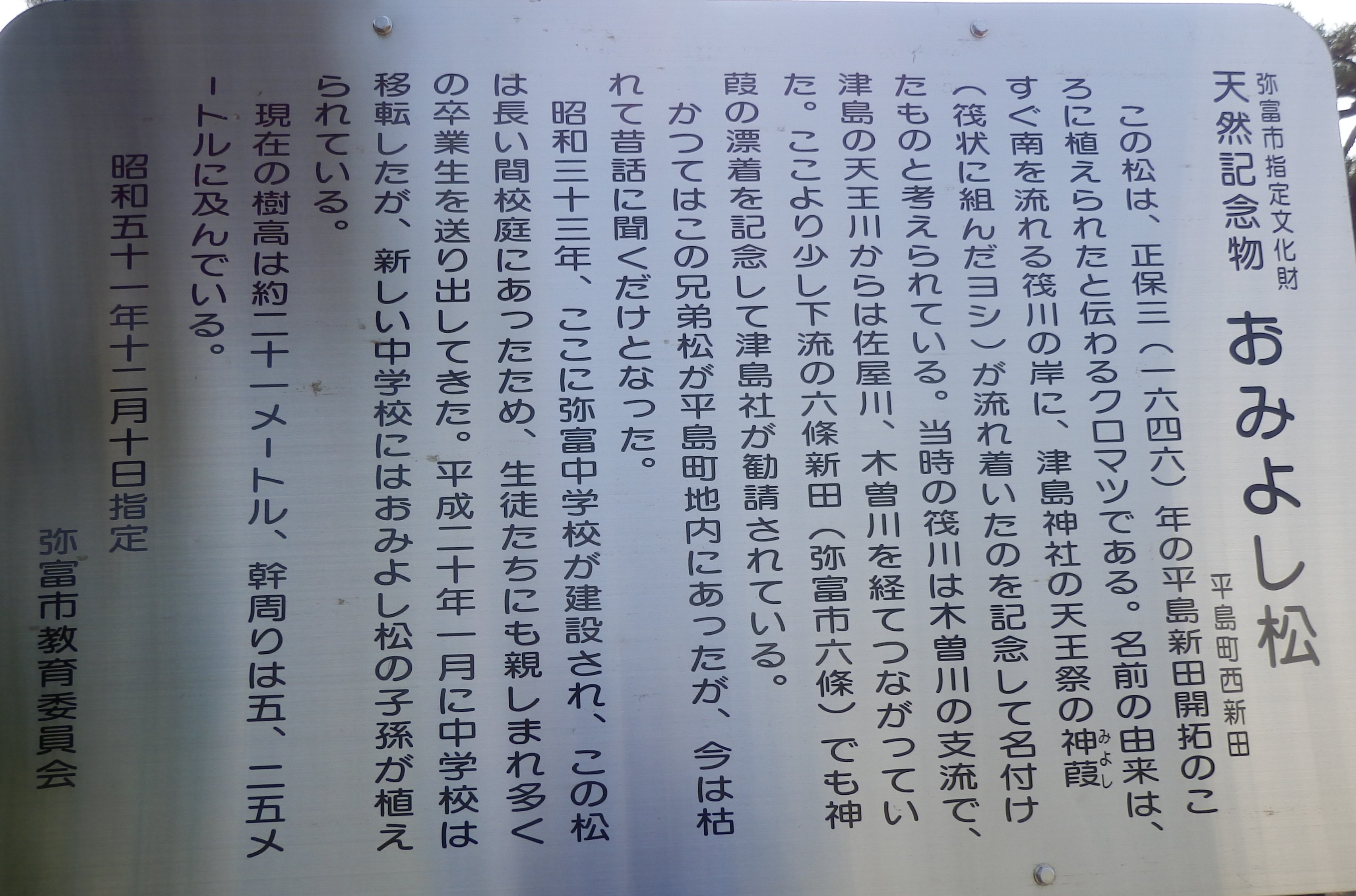 (H28.4.2)おみよし松n61t122 樹種:クロマツ 樹齢:約350年 Top 大きさ:高さ約21m、幹周り5.25m 弥富市指定天然記念物 | |