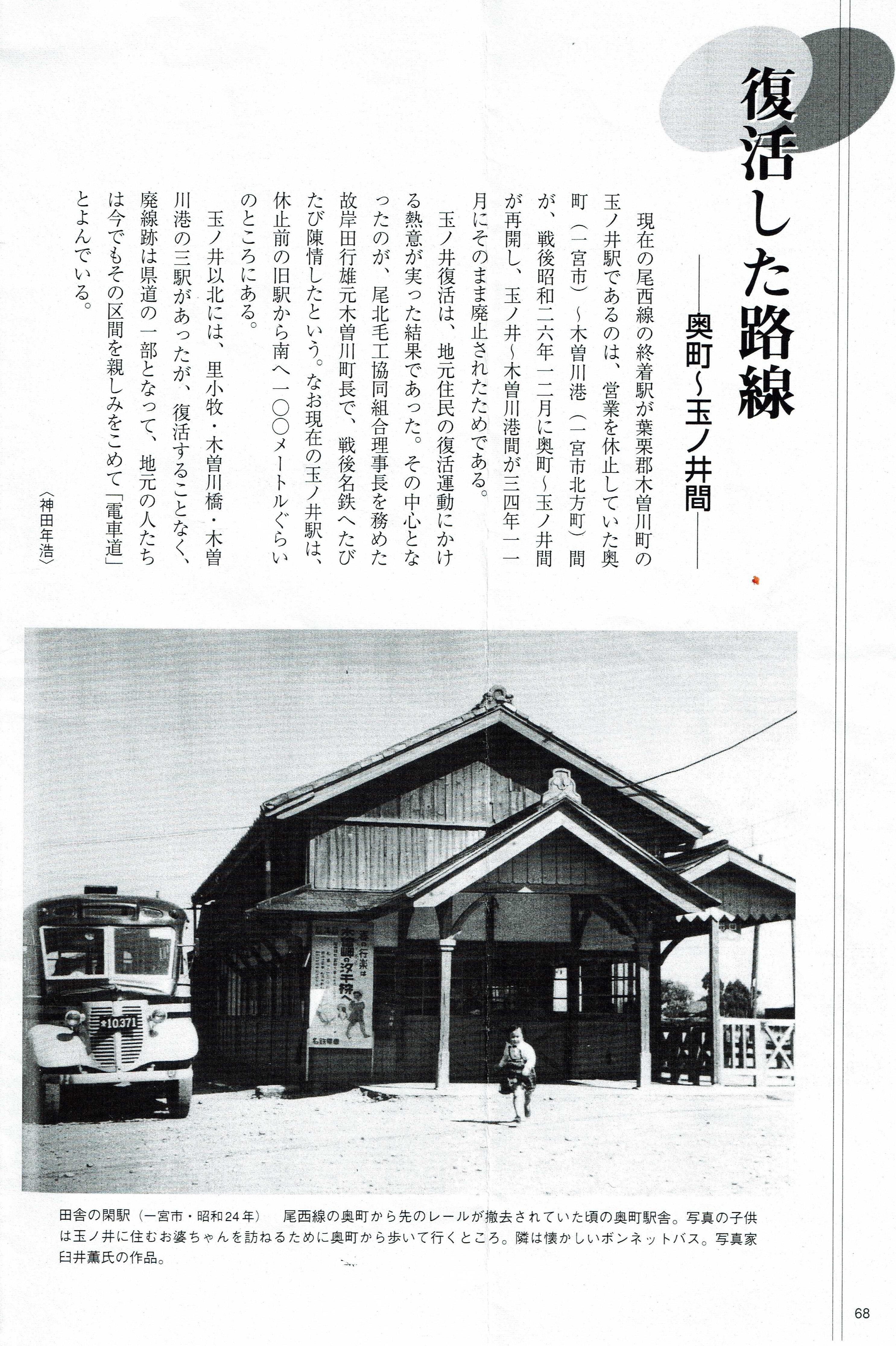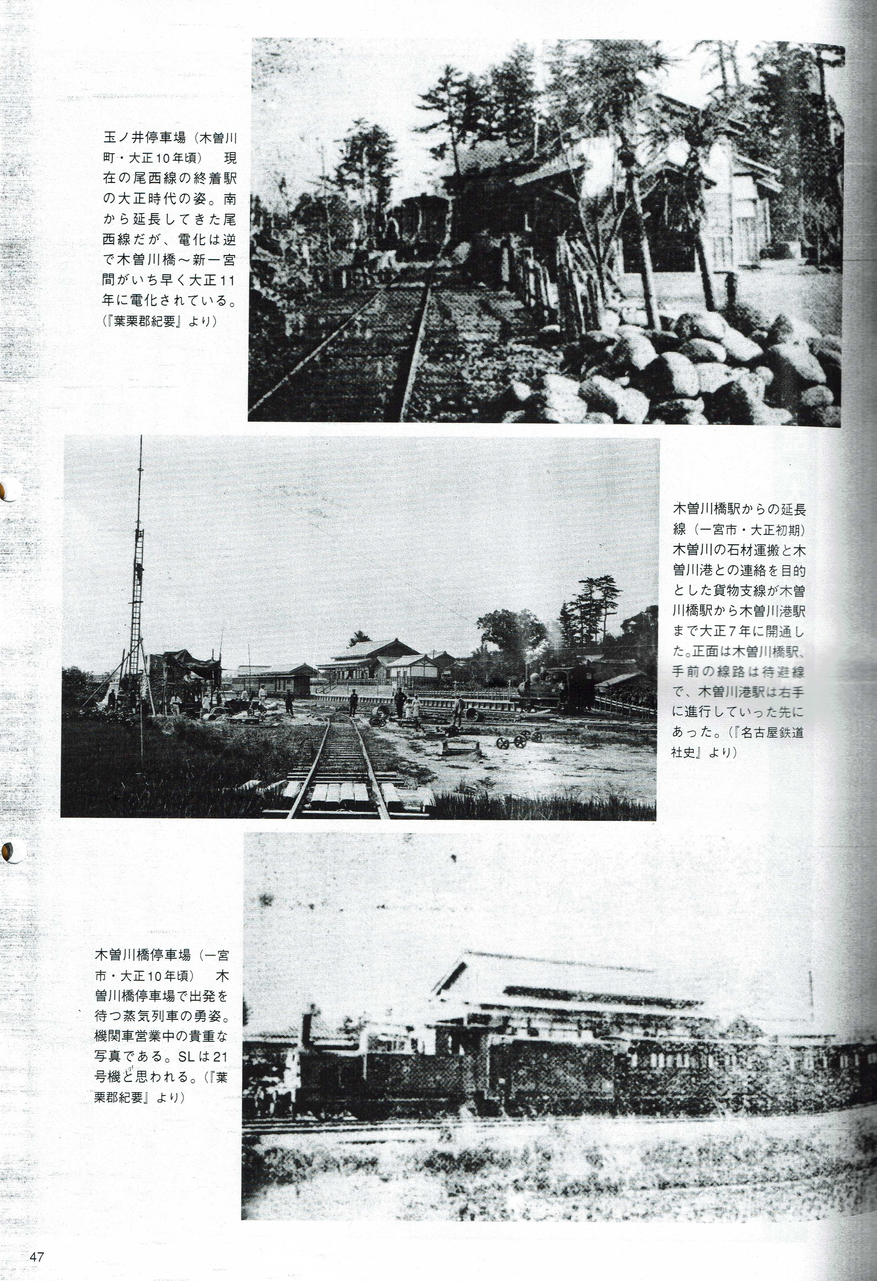 『尾西線の100年』保存版(尾西児童図書館所蔵 2021.2.28 尾西児童図書館でコピー)(bisaisen100.jpg) (★尾西児童図書館は3月末で閉館/存続を求めるHP(れんげニュース)はこちら) Top 上から順に玉ノ井駅停車場(大正10年頃)〜木曽川橋駅(木曽川港駅は右手に進行していった先にあった)〜木曽川橋停車場(出発を待つSLは21号機) 〜尾西線・廃線区間の里小牧付近 |