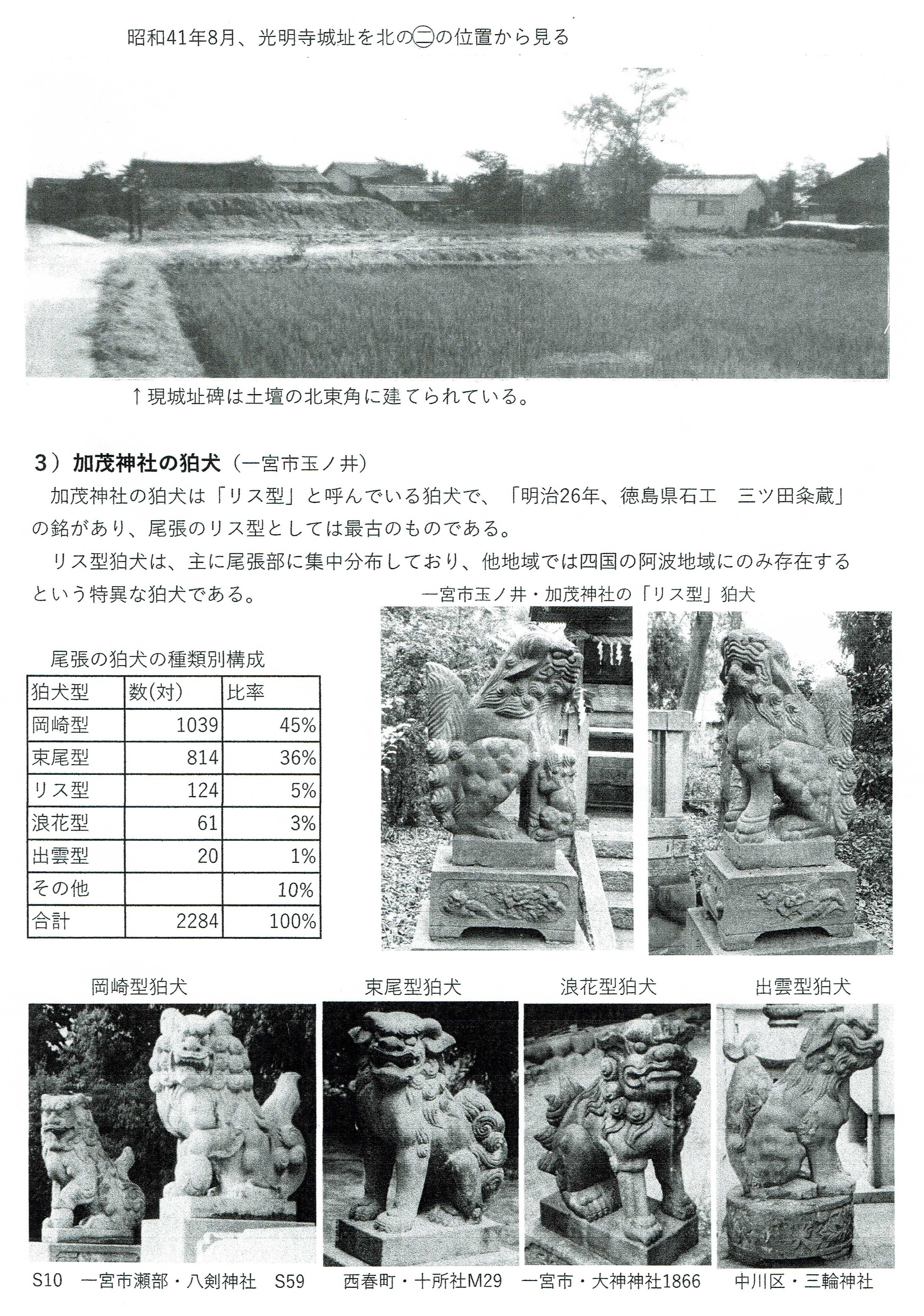 光明寺城の高さ2mの土壇(昭和41年8月MKさん撮影)と賀茂神社の狛犬(リス型で5%と比率は少ない)の解説 Top![]() |