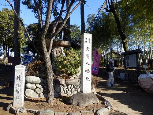 ★宮後城祉北側県道64号線に宮後城跡の標柱、南側側に説明書が設置してあります。 宮後八幡社の脇に宮後城跡と蜂須賀家政公生誕地の位置の見取り図がある。Top Top