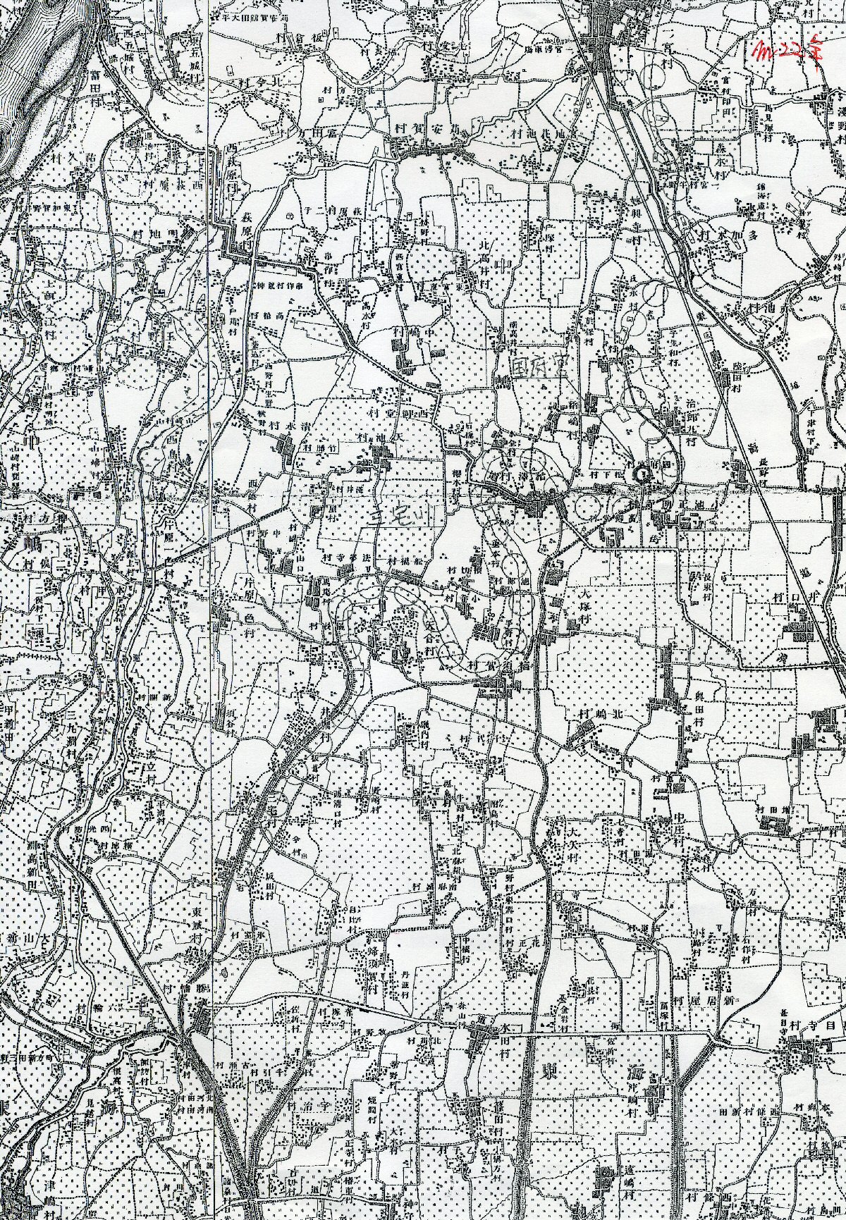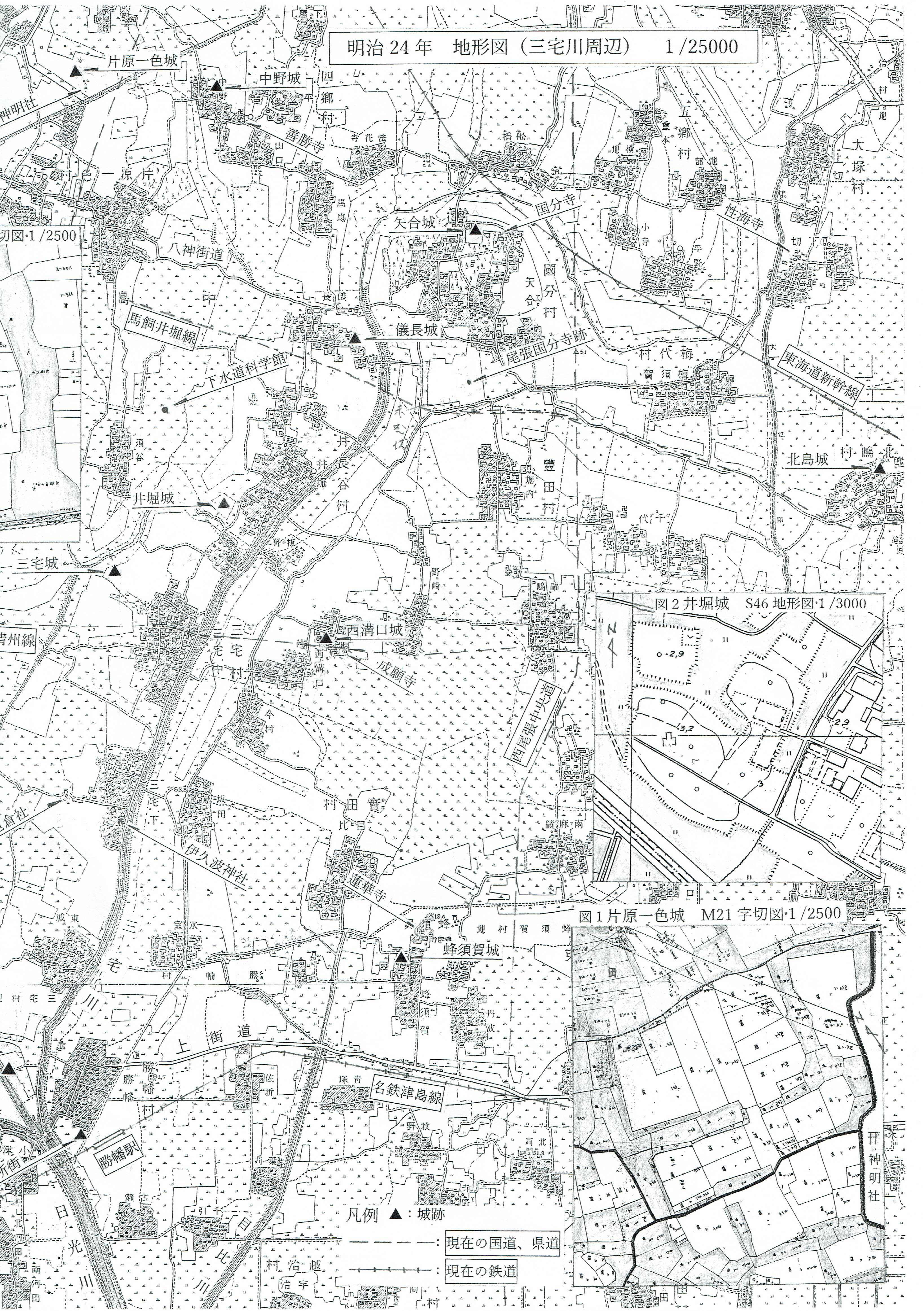 一宮あたりから南下する三宅川が国府宮付近で蛇行する(○で記されている)の様子が良く分かる。 Top (6.7友歩会参考資料・明治22年作成) ![]() |