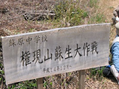 ![]() 権現山山頂近くに蘇生大作戦の看板があった |