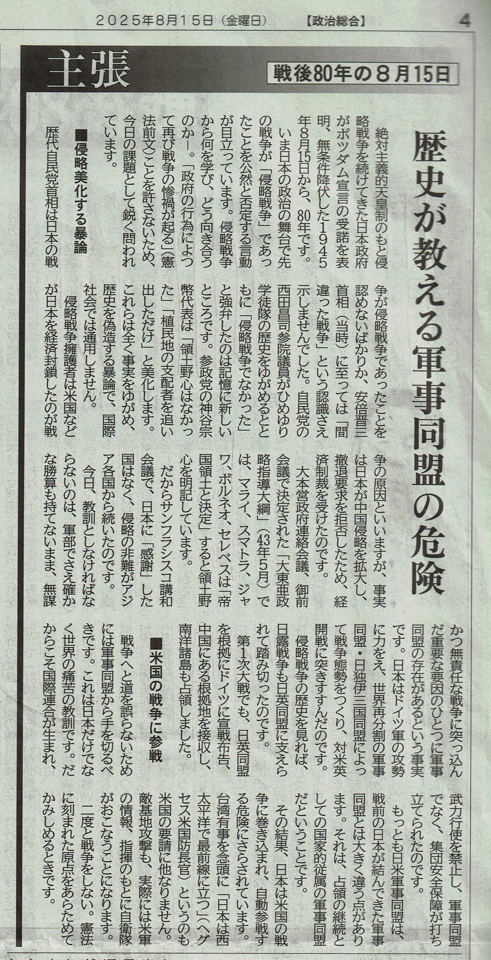 戦後80年 侵略戦争と植民地支配 正面から向き合うとき(HP)(しんぶん赤旗2025.8.15号左記HP内にもあります。)sengo80.jpg![]() |