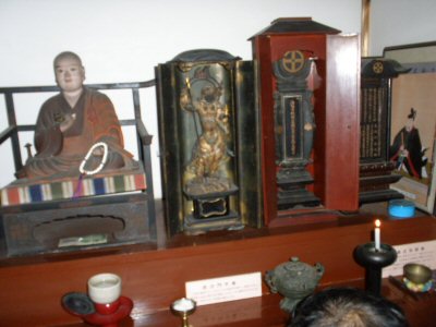 ![]() 中央:木造毘沙門天(31.5cm)正則公の御持仏 その右:正則公御位牌(4.10)中貫十文字の家紋 |