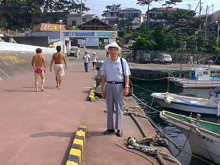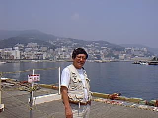 25年ぶりに再会の山田さん(背後は熱海市温泉街)