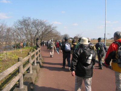 ![]() 晴天の下、木曽川沿いの遊歩道を歩く |