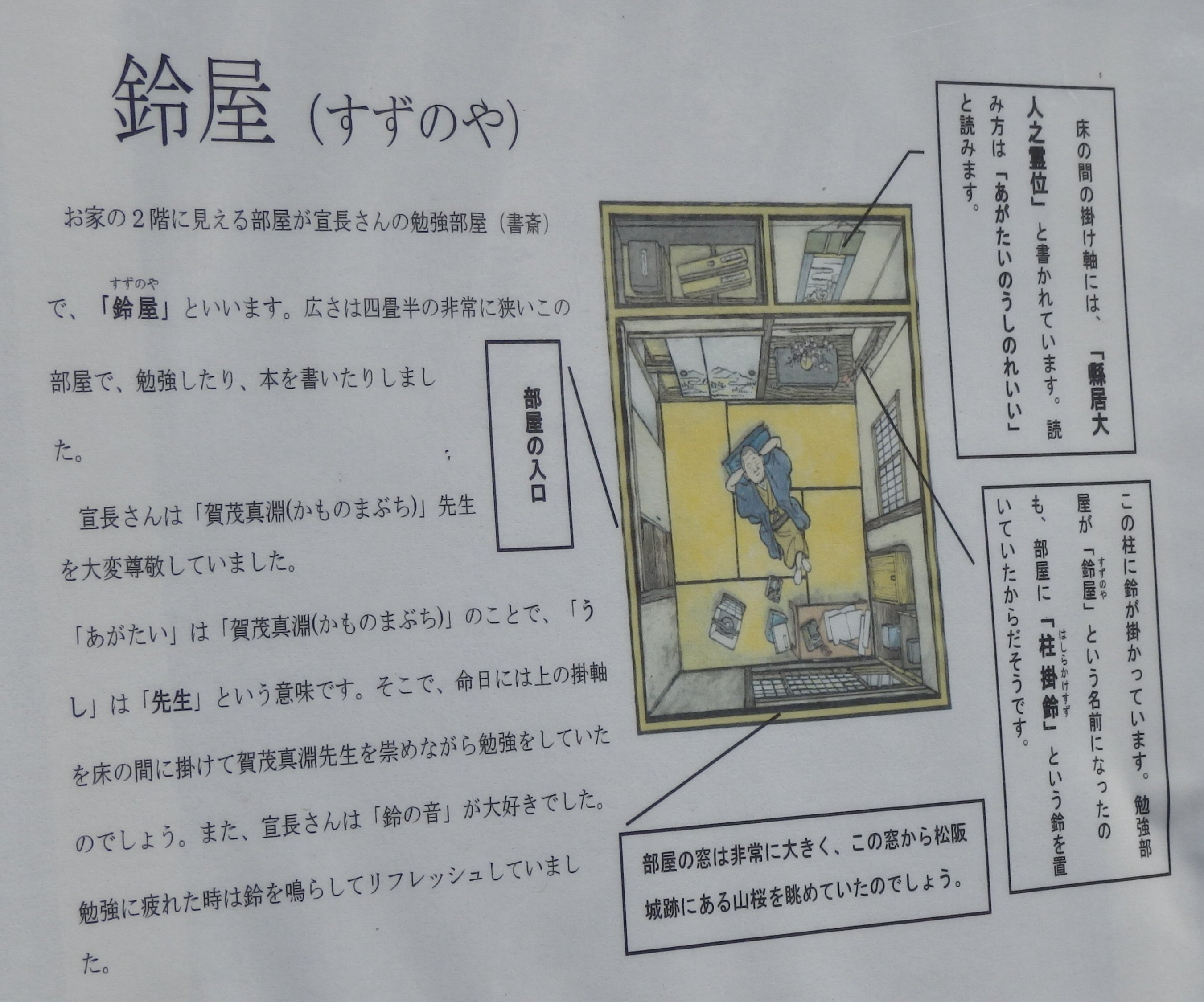 で暮らし、2階の書斎を鈴屋(すずのや)と名づけた。1909年(明治42年)に保存のために松坂城跡の現在地に移築され、