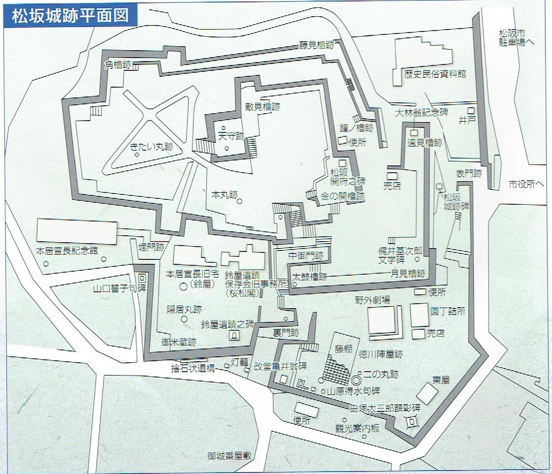 現在は石垣のみが残っており、城址公園となっている。周囲には松阪市役所、市民病院、当地出身の本居宣長記念館など