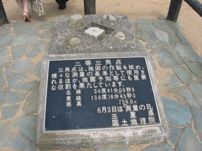 測量の基準になる三角点(標高756m) 三角点から見た青山高原の風車群