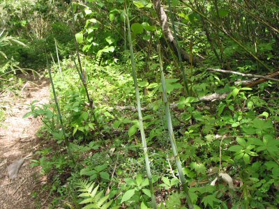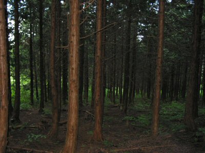 ![]() 杉林の林道は薄暗くて涼しかった。 |