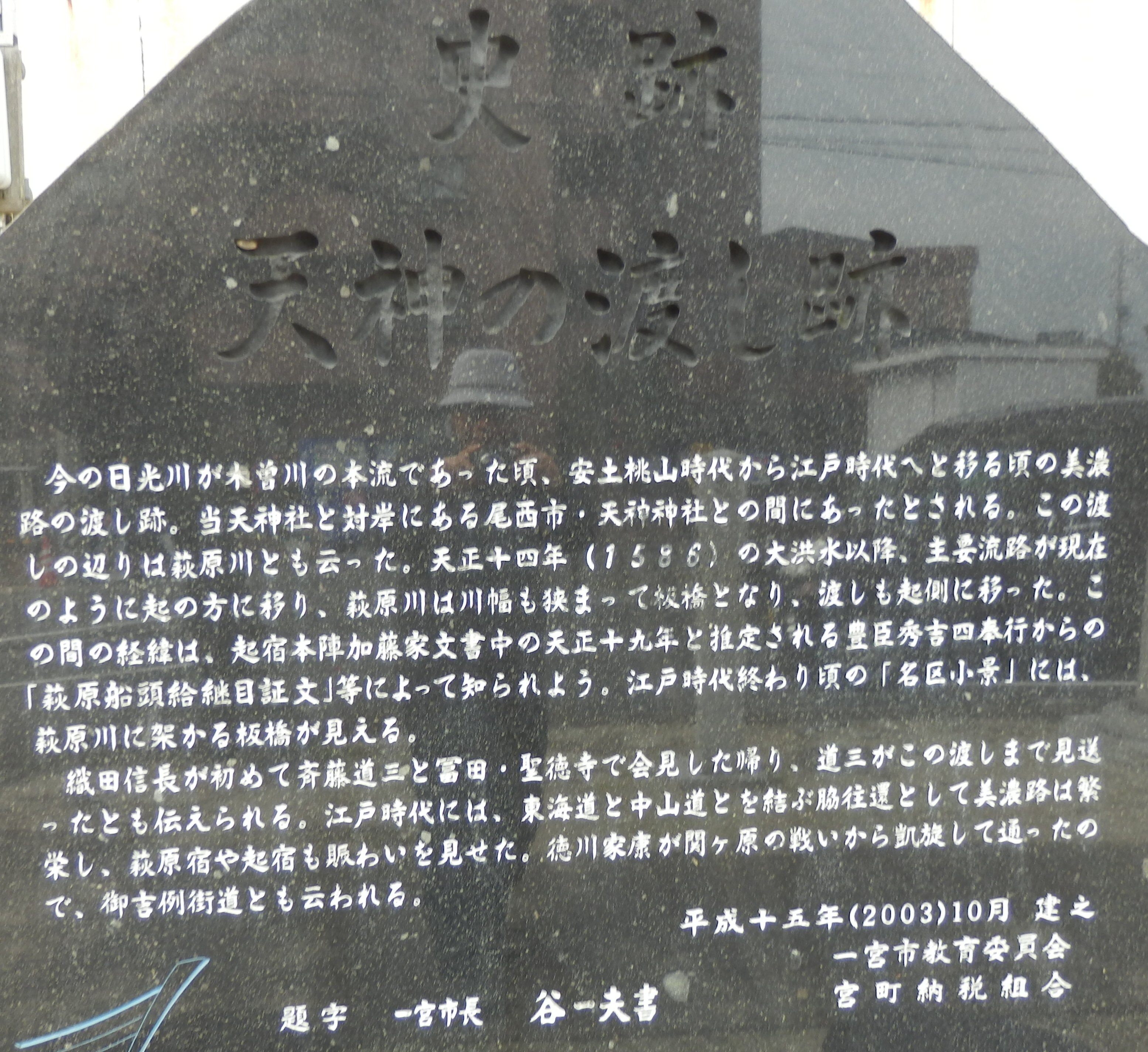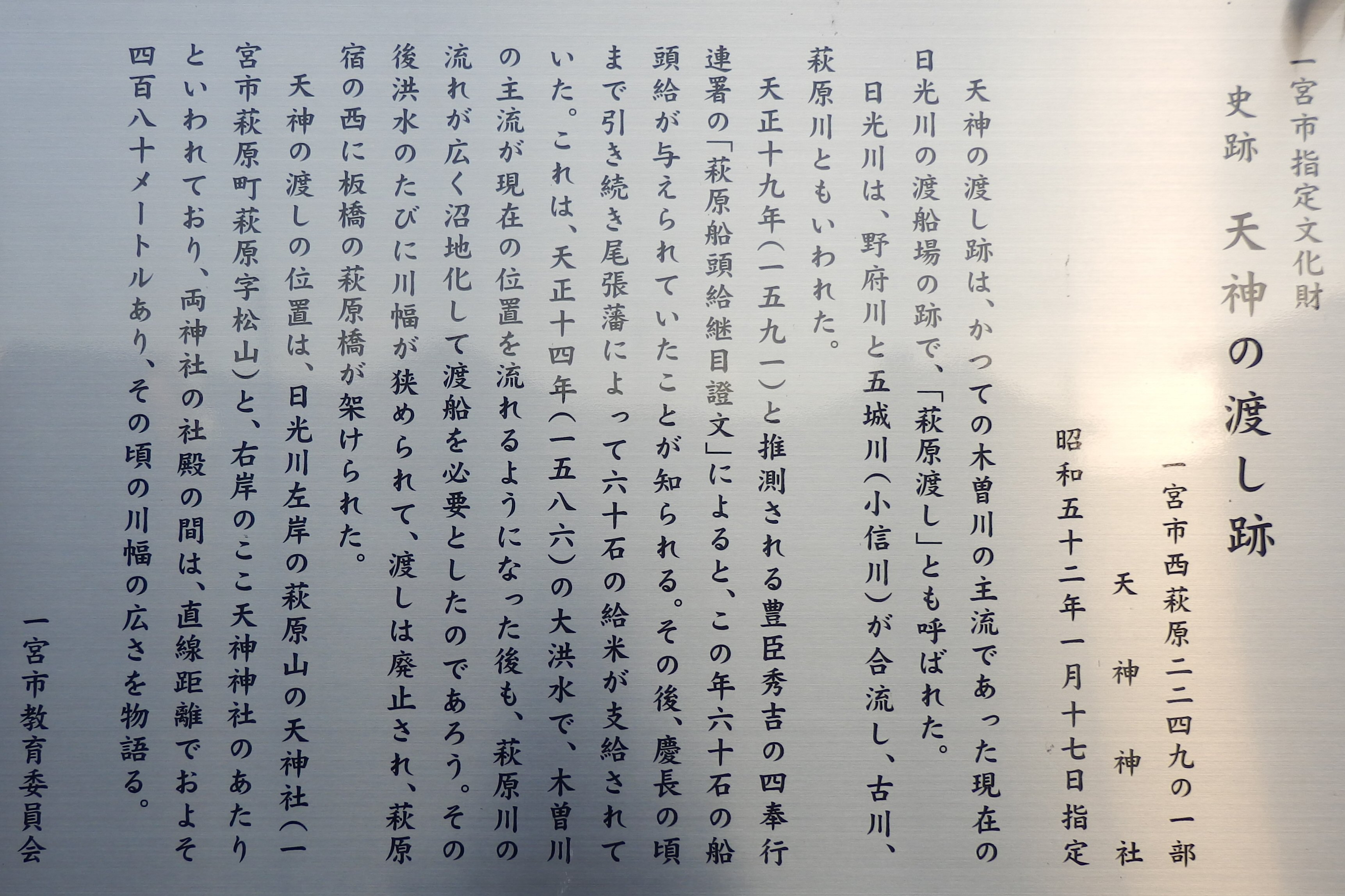 天神の渡し跡(一宮市萩原町・日光川の東側) ★topへ ★topへ★一宮指定文化財 史蹟 天神の渡し跡 天神の渡し跡は、かって之木曽川の主流であった現在の日光川の渡船場の跡で、「萩原渡し」 とも呼ばれた。 日光川は、野府川と五城川(小信川)が合流し、古川、萩原川ともいわれた。 天正十九年(1591)と推測される豊臣秀吉の四奉行連署の『萩原船頭給継目証文』によると、 この年六十石の船頭給が与えられていたことが知られる。 その後、慶長の頃まで引き続き尾張藩によって六十石の給米が支給されていた。 これは天正十四年(1586)の大洪水で、木曽川の主流が現在の位置を流れるようになった後も、 萩原川の流れが広く沼地化として渡船を必要としたのであろう。 その後洪水のたびに川幅が狭められて、渡しは廃止され、萩原宿の西に板橋が架けられた。 天神の渡しの位置は、日光川左岸の萩原山の天神(一宮市萩原町萩原字松山)と、右岸のここ天神 神社のあたりといわれており、両神社の社殿の間は、直線距離でおおよそ四百八十メートルあり、 その頃の川幅の広さを物語る。 (一宮教育委員会) |