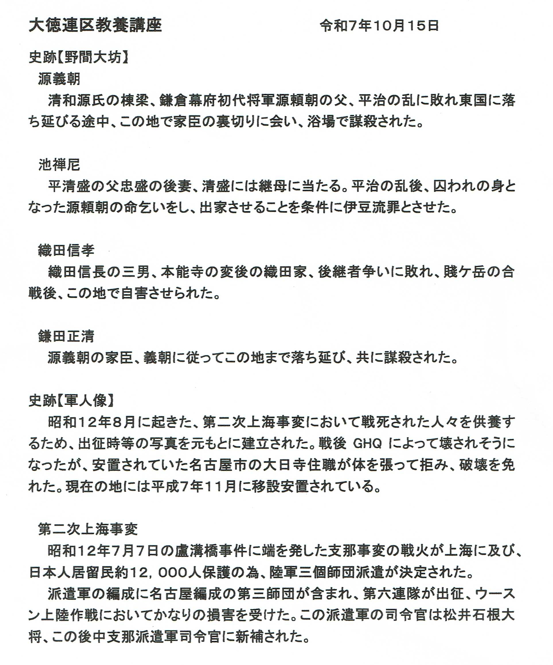 大徳連区教養講座:野間大坊、上海事件の痕跡・軍人像他見学レポート