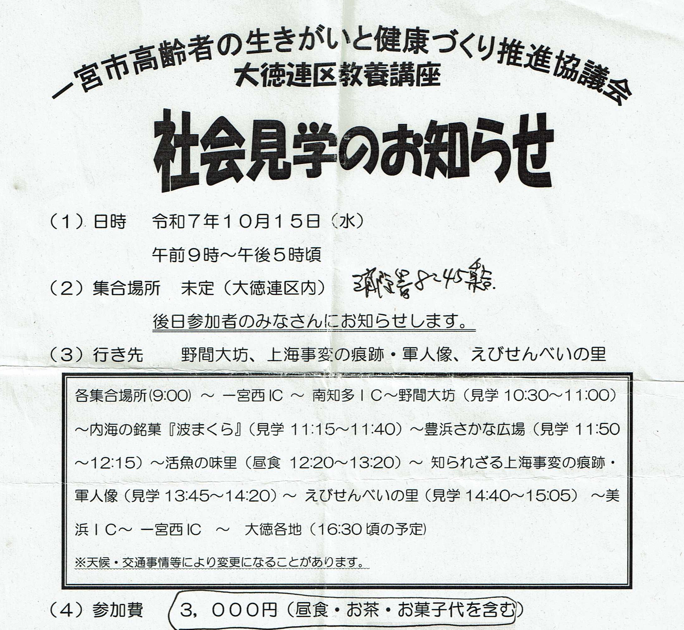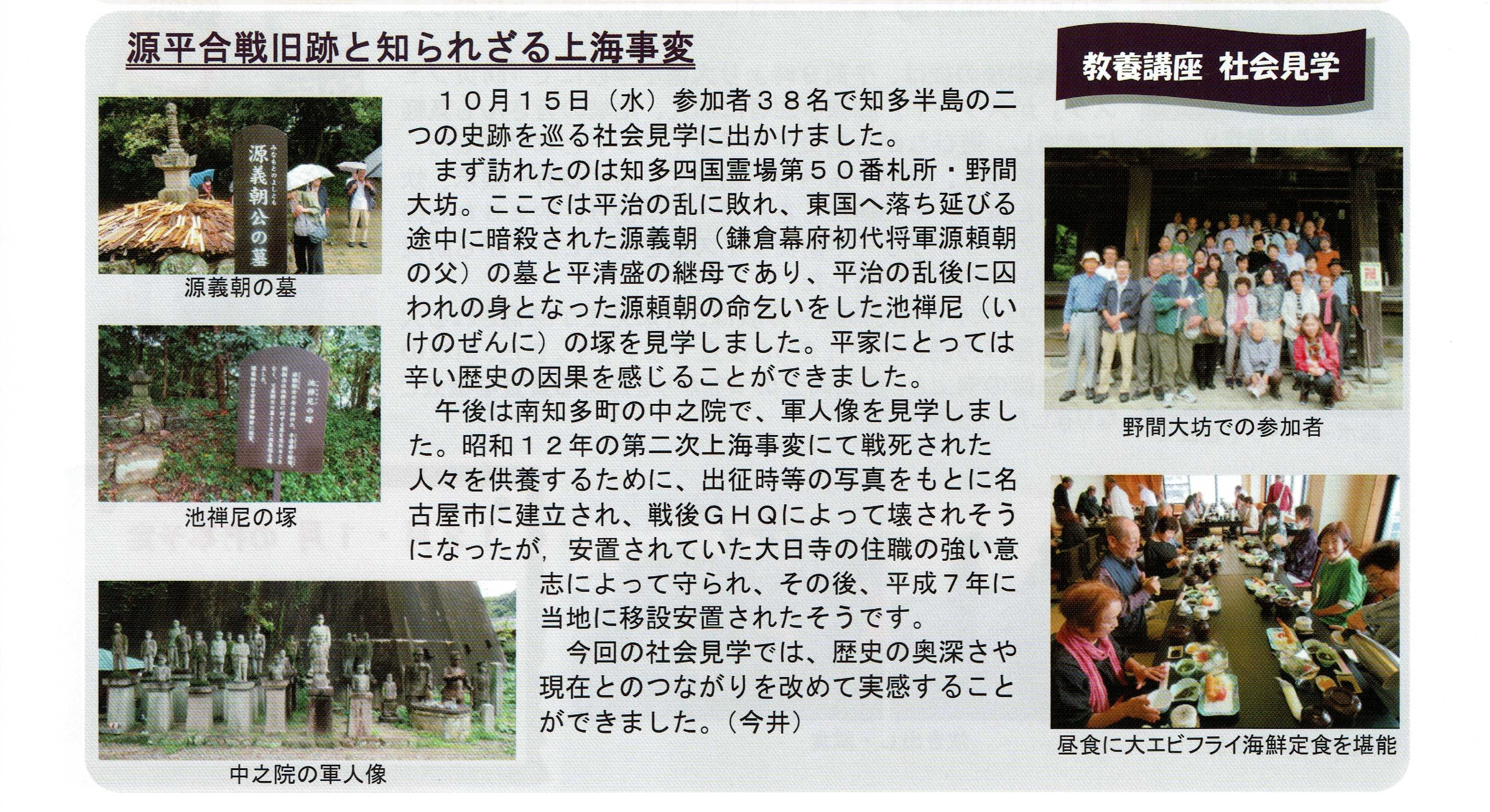 行程:尾西消防署〜野間大坊〜内海の銘菓『波まくら』〜豊浜さかな広場〜活魚の味里(昼食)〜