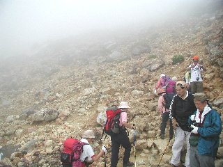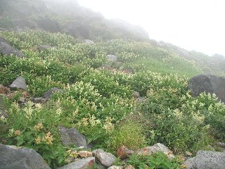 岩間に咲く高山植物群 登る人・降りる人(互いに励ましの挨拶を交わした。)