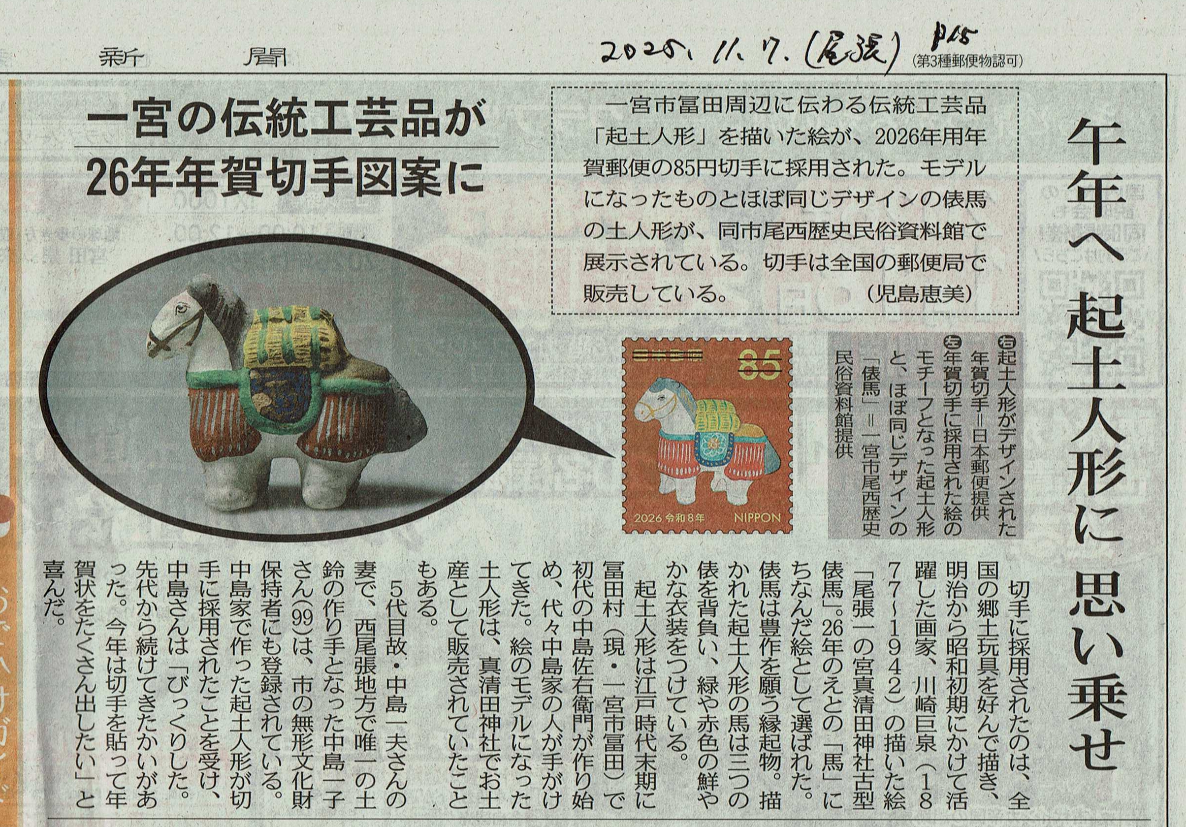 起土人形の俵馬が来年(午年)の切手に(PDF参照) チラシ索引Top Top2025.11.07中日新聞p15尾張版「一宮の伝統工芸が26年年賀切手図案に」 jcp/20251107ema.jpg ![]()