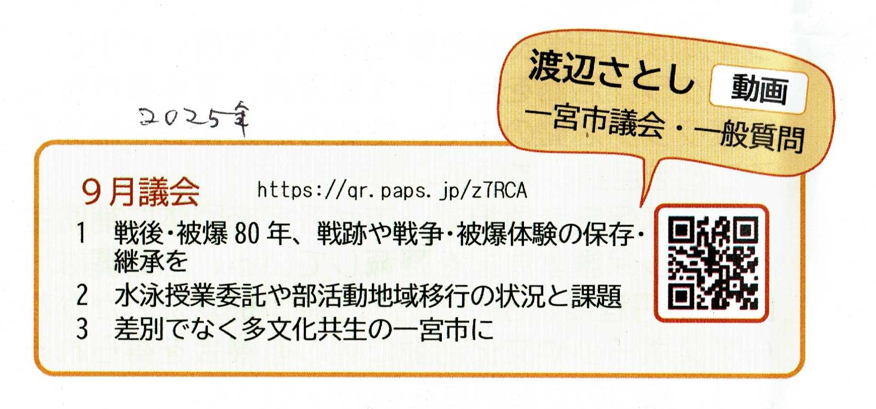 渡辺さとし9月議会市政レポート(表・一部) jcp/wa9gatu1.jpg(#9) チラシ索引Top Top★9月市議会の一般質問録画映像(★彦坂和子9.10&★渡辺さとし9.11) ![]()