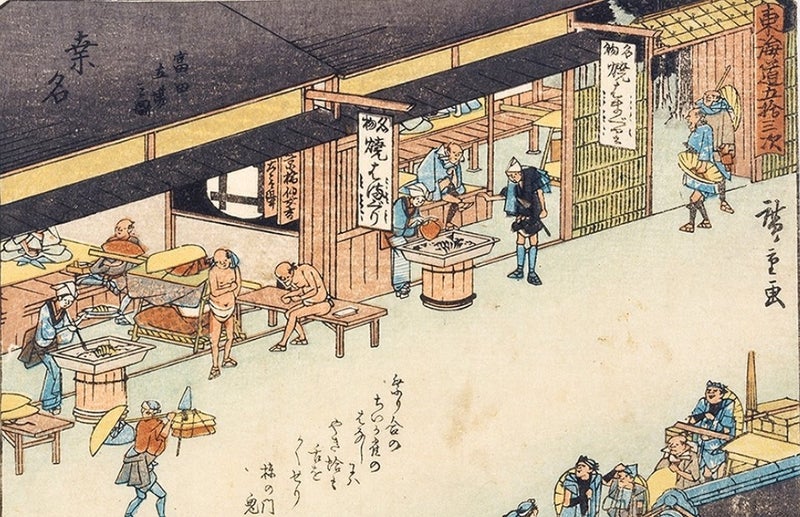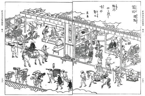 ★立場(Web参照) 街道には伝馬人足が休憩する場所として決められた立場がありました。人足が使った杖を立てておく事から立場と いうようです。また、立場には伝馬人足だけでなく一般の旅人も利用し旅の疲れを癒しました。 立場の中でも宿場と宿場の中間にあるものは、間(あい)の宿といい、茶店が建ち並ぶ風景は、ちょっとした宿場 のようで、ところによって名物があり、旅の楽しみともなりました。 |