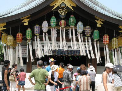 ![]() 真清田神社本殿の飾り付け。29日は 七夕祭りの最終日。多くのイベントがあった。 |