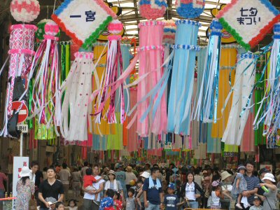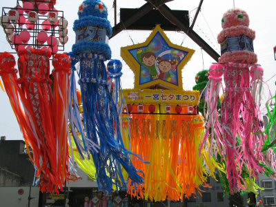 ![]() 吹き流しなどの七夕飾りが賑やかだ |
