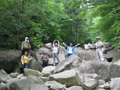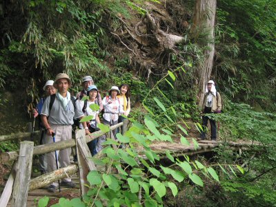 ![]() 天河滝の岩場でしばし疲れを癒す。(上) 右上は、林道の橋で危ないところもあった。 右下は、夏でも涼しい林道を下山した。 |