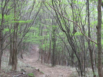 ![]() 小倉山へ至る尾根の林道には笹が多く自生していた |