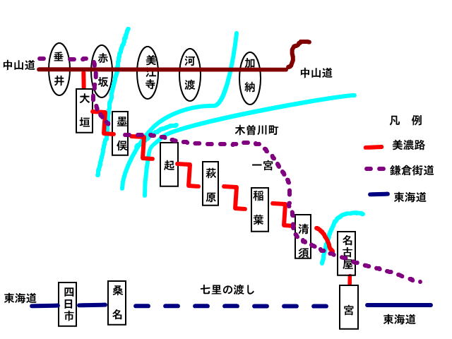 美濃路マップ (★Web美濃路参照)![]() ![]() 美濃路のおもな史跡(@〜E)〜尾張編(約29.5km〜) 及び美濃編(約28km)(F〜H) (美濃路<中山道垂井宿〜東海道宮の宿>約57.5km) (全長十四里二十四町十五間(約57.5km)、慶長5年家康が関ヶ原の戦いから凱旋の 帰路、この道を通って帰ったことから「お悦び街道」とも呼ばれている)◎@【起宿】(美濃路)(Wikipedia) 起宿(おこしじゅく)は、美濃路の宿場である。現在の愛知県一宮市(旧尾西市)に ある。木曽川沿いにあり尾張国と美濃国の境にあたる。木曽川に設けられた起渡船場は、 上の定渡船場、中の宮河戸、下の船橋河戸の3ヶ所の渡し船が設置されていた。 船橋河戸には、将軍上洛時と朝鮮通信使が通る時に、270隻の船を使用した長さ約800mの 船橋が架けられた。(人柱観音・定渡船場跡・宮河戸跡・船橋跡・本陣及び問屋場跡・脇本陣跡) 〜駒塚道道標・冨田一里塚跡・天神の渡し跡・孝子佐吾平の碑・萩原橋〜◎A【萩原宿】(美濃路)(Wikipedia) 萩原宿(はぎわらじゅく)は、美濃路の宿場である。現在の愛知県一宮市萩原町にある。 日光川の東に位置する。美濃路の宿場では最も小規模である。 現在の一宮市萩原町は宿場としての建物は少なく、商店街になっている。 商店街は昭和30〜40年代のレトロな感じがある。 毎年5月には萩原宿チンドン祭りが行なわれる。 (本陣・問屋場跡)〜高木一里塚跡・中嶋宮・長隆寺〜◎B【稲葉宿】(美濃路)(Wikipedia) 稲葉宿(いなばじゅく)は、美濃路の宿場である。現在の愛知県稲沢市にある。 初めは稲葉村だけであったが、後に小沢村が加宿となった。ちなみに現在の稲沢市は稲葉 村と小沢村の合併によるもので、市の名称はこの2村の名を1字ずつとったものである。 本陣跡と問屋場跡に石碑が建つのみだが、古い町並みがよく残っている。 清須城主・織田信雄が、小牧・長久手の戦いの前に造らせたのがこの街道の起源とされる。 明治2年(1869年)の稲葉騒動では、この宿場への打ちこわしから始まり、やがて西尾張 全域に拡大していった。近代から昭和にかけても、稲沢銀行や稲沢電気が置かれるなど市 の商業地区として賑わいをみせた。 現在では、老舗の多い商店街として、メディアにたびたび紹介されている。(禅源寺・問屋場跡・津島道道標・本陣跡・稲葉一里塚跡) 〜国府宮・長束正家邸跡・四ツ家追分・丹羽盤桓子出生地・長光寺(四ツ家追分道標・ ・六角堂・臥松水)・浅野長勝宅跡・亀翁寺・総見院〜 ◎C【清須宿】(美濃路)(Wikipedia) 清須宿(きよすじゅく)は、美濃路の宿場である。現在の愛知県清須市にある。 清洲城の城下町であったが、いわゆる清洲越しによって町ごと名古屋城下に移転して、 いったん清須の町はさびれた。しかし、慶長7年(1602年)に美濃路の宿駅となって町は 宿場町として再生した。 史跡・みどころ 清凉寺 門前は高札が立ち、札の辻と呼ばれた。 本陣跡 将軍上洛、朝鮮通信使、お茶壺道中、そして明治天皇の休泊所となった。 清洲城文化広場 清洲城は慶長15年(1610年)に廃城となった。現在の天守閣は、清洲町の町政100周年 記念事業として再建されたもので、正式には「ふれあい郷土館」。 入場料 大人300円 小人150円。 稲葉宿までの史跡・みどころ 「北市場 美濃路公園」 長光寺 地蔵堂(六角堂)は国の重要文化財。境内に四ツ家追分にあった道標が移設されている。 盤桓子誕生地。 四ツ家追分:美濃路と岐阜街道との追分、現在は稲沢市による石碑が建つ。 七曲縄手 国府宮神社一ノ鳥居(本陣跡・清涼寺・清洲城跡) 〜五条橋・元須ヶ口一里塚道標・須ヶ口一里塚跡・新川橋橋詰ポケットパーク・瑞正寺宝塔・ ・屋根神様・西枇杷島問屋記念館・枇杷島橋・清音寺・屋根神様・尾州茶屋跡・ 白山神社・大木戸跡・江川一里塚跡・名古屋城・五条橋・四間道・屋根神様・伝馬橋〜 ◎D【名古屋宿】(美濃路)(Wikipedia) 名古屋宿(なごやじゅく)は美濃路の宿場である。現在の愛知県名古屋市中区にあった。 尾張藩の城下町で、慶長18年(1613年)に宿駅となって伝馬会所や御触書を掲げる高札場 も置かれたが、本陣や脇本陣はなかった。 また寛文5年(1665年)には飛脚会所も置かれている。美濃路の他に勝川・内津・土岐・ 釜戸などを経て中山道槙ヶ根追分へと至る下街道など、交通の要衝でもあった。 現在ではビル街となっており、往時の様相は残されていない。(辻の札)〜大須観音・西別院・東別院・古渡城跡・佐屋道標・熱田神宮一の鳥居跡・ ・断夫山古墳・源頼朝生誕地(誓願寺)・白鳥御陵道標・熱田神宮・上知我麻神社〜 ◎E【宮(熱田)宿】(東海道)(Wikipedia) 宮宿(みやじゅく、宮の宿、熱田宿)は、東海道五十三次の41番目の宿場。中山道垂井宿 にいたる脇街道美濃路や佐屋街道との分岐点でもあった。一般には宮の宿と呼ばれること が多かったが、幕府や尾張藩の公文書では熱田宿と書かれている。 場所は現在の愛知県名古屋市熱田区にあたる。東海道でも最大の宿場であり、天保14年に は本陣2軒、脇本陣1軒、旅籠屋は248軒を擁し、家数2924軒人口
