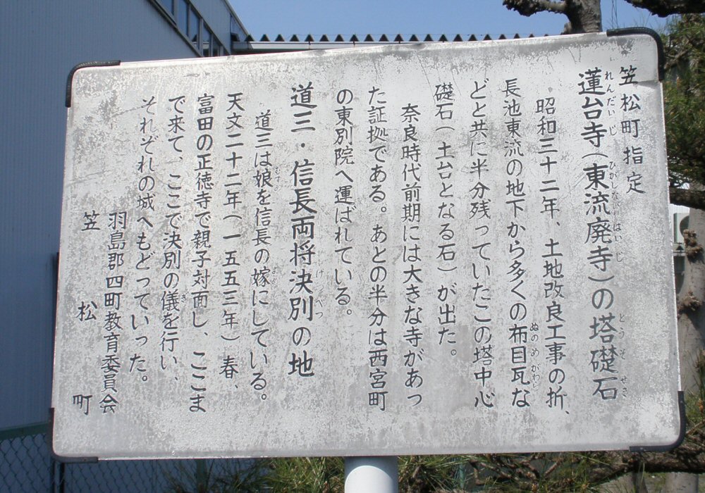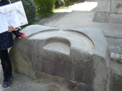 郡役所跡(新町) 明治12年(1879)郡役所が県下で16箇所に 置かれ、笠松村には羽栗・中島両郡の郡役所が置か れましたが、明治24年(1891)の濃尾震災で 燃えてしまいましたが、同27年新町に移転改築さ れました。 その後、羽栗・中島郡役所は新郡制が施行されると 羽島郡役所となり、大正15年(1926)に廃止 されました。 | 東流廃寺(蓮台寺)の塔礎石(白鬚神社内) 昭和32年(1957)、長池東流地区で土地改良 工事を行っていた時、土中から礎石や瓦等が発見さ れました。礎石には二重の穴があいていて、その大 きさから塔の高さは30メートル近くあったのでは ないかと推測されます。 このお寺は、出土した場所から東流廃寺と呼ばれ、 いくつかの建物や門などがあったと思われます。 この礎石は2つに割られ、西宮町の東別院と田代の 白鬚神社に残されています。★Top |